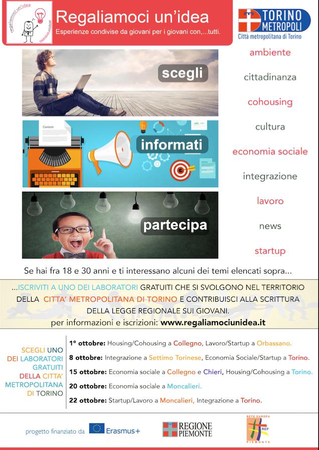 Se hai tra 18 e 30 anni e ti interessano alcuni di questi temi: Ambiente, cittadinanza, cultura, economia sociale, lavoro, news, startup, iscriviti ad uno dei laboratori gratuiti che si svolgeranno nel territorio della Città Metropolitana di Torino e contribuisci alla scrittura della Legge Regionale sui giovani. per informazioni e iscrizioni www.regaliamociunidea.it