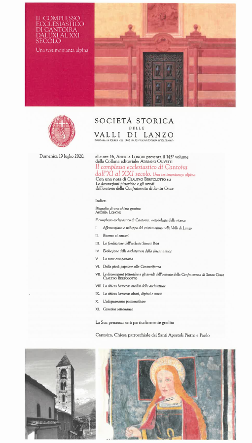 Domenica 19 luglio 2020 alle ore 16.00, nella Chiesa Parrocchiale dei Santi Apostoli Pietro e Paolo sita in Cantoira, Andrea Longhi presenta il 145° volume della Collana editoriale: ANDREA OLIVETTI "Il Complesso ecclesiastico di Cantoira dal XI AL XXI secolo. Una testimonianza alpina" con una nota di Claudio Bertolotto su Le Decorazioni pittoriche e gli arredi dell'oratorio della Confraternita di Santa Croce.